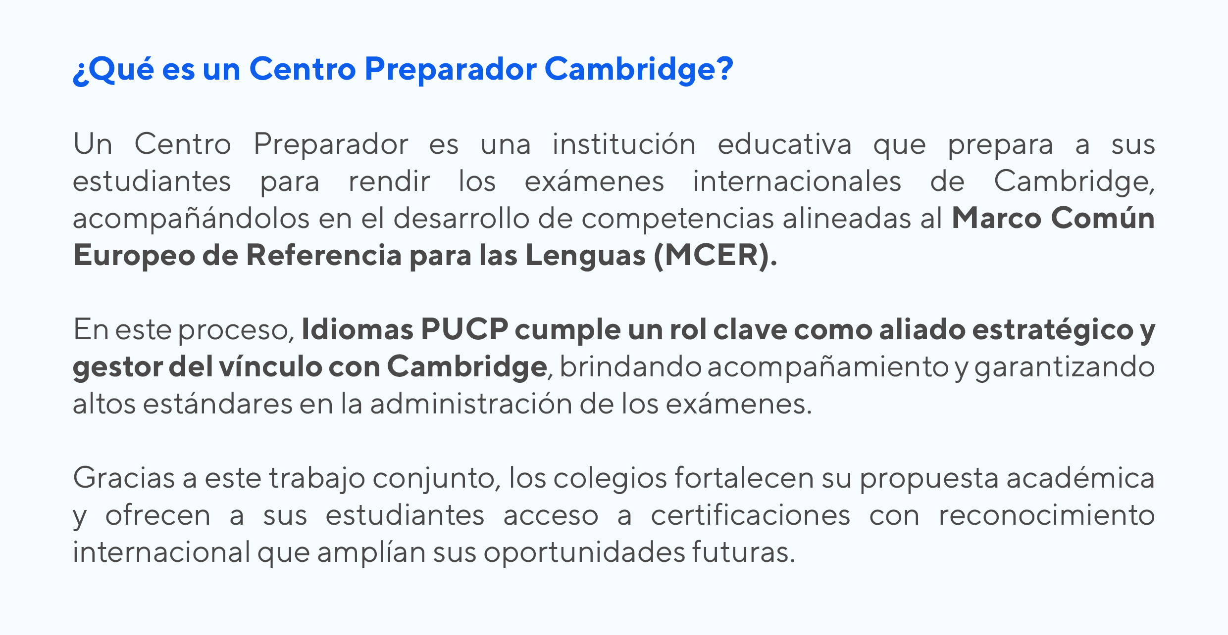 Asimismo, refuerza el liderazgo de Idiomas PUCP como referente nacional en certificaciones internacionales, consolidando su rol como institución que articula esfuerzos con Cambridge para elevar la calidad educativa en el país.
